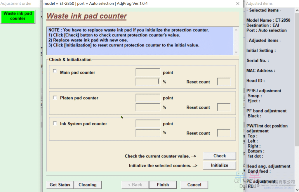 公告事項, 新品公告EPSON ET-1810 ET-2800 ET-2803 ET-2810 ET-2811 ET-2812 ET-2814 ET-2815 ET-2820 ET-2821 ET-2825 ET-2826 ET-4800 (EURO) 清零軟體 發佈 發佈於2024 年 2 月 3 日2024 年 2 月 3 日 作者 呆呆 電子商務 可支援維修維護調整功能,也可以清零廢墨計量數據!! 目前不提供下載。僅為資訊發佈!! 分享給好友>>> 呆呆 電子商務 維修機種:EPSON L5190 | 問題:彩色堵塞、黑色不順暢 | 檢測結果:墨囊掏空,噴頭堵塞 | 檢修日期:2024年1月30日 EPSON ET-2850 ET-2850U ST-C2100 (EAI) 清零軟體 發佈