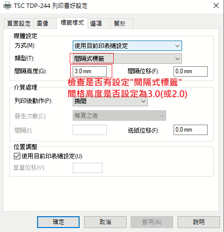 TSC , 使用說明&教學&資料 , 印表機、標籤機、掃描槍 , 技術支援【技術支援】TSC TTP-244 Pro 熱/轉感印標籤機 常見問題與注意事項!! (20260316更新) 發表於 2026 年 3 月 16 日2026 年 4 月 13 日 由呆呆 電子商務 有問題無法解決的,可加入我們官方LINE聯繫,工程師可遠端協助解決!!PS.機器為我司購買者,若工程師有需要遠端協助解決,一個月內免費服務,超過一個月以上收費$200, 機器非我司購買者,需遠端協助解決,收費$500. Q001:機器安裝了碳帶,為什麼列印的時後碳帶軸不會轉動!? 如何排除!?遇到此問題,請先參照底下的方法測試跟排除,千萬不要以為是機器有問題,那就會搞笑嚕!^^ 通常遇到這問題,多數試碳帶軸沒有安裝好, 您可以在蓋子打開的狀態下,點擊列印,觀察碳帶軸的底端是否有轉動, 如果底端有轉動,但是碳帶軸沒轉動,那就是沒有安裝好!! 另外一種情況,就是驅動程式裡的列印模式選擇錯誤, 當您的列印模式選擇了直接感熱(熱感印模式)(不用碳帶),那列印的時候碳帶軸是不會轉動的!! 當您的列印模式選擇了感熱轉印(熱轉印模式)(要裝上碳帶),那列印的時候碳帶軸才會轉動的!! 具體可以參考我們工程師的維修影片有提及這個部分: 分享給好友>>>Q002:列印標籤紙的時候,列印多張時,位置會跑掉,該如何調整??這個可能是幾種原因造成, 1、實際放入的標籤與列印喜好設定的驅動程式內設定的標籤大小不同。 2、驅動程式內沒有設定”間隔式”標籤,或沒設定正確的間隔數值(通常是3.0或2.0)。 3、機器內部暫存記憶跑掉,請進行恢復原廠設定後,再進行標籤紙間隔偵測即可。 若上述都無法解決,請聯繫原廠或維修公司送修檢測。 1跟2的處裡方式請參照如下: PS.下圖是標籤紙列印多張的時候,位置跑掉了。 若上述調整後,依舊無法恢復,請嘗試將機器恢復原廠設定,並進行間距檢測!! 分享給好友>>>Q003:如何讓機器重新偵測標籤紙的間距!? 分享給好友>>>Q004:如何讓機器恢復原廠設定!? 分享給好友>>> 分享給好友>>> 呆呆 電子商務 【技術支援】EPSON C5890 出現 無法打印 PostScript、PCL或PDF文件 如何解決??? 【技術支援】PS3/PS4/PS5/Switch Pro/XBOX One/S 手把藍芽接收器(免驅動)連接使用教學(影片)