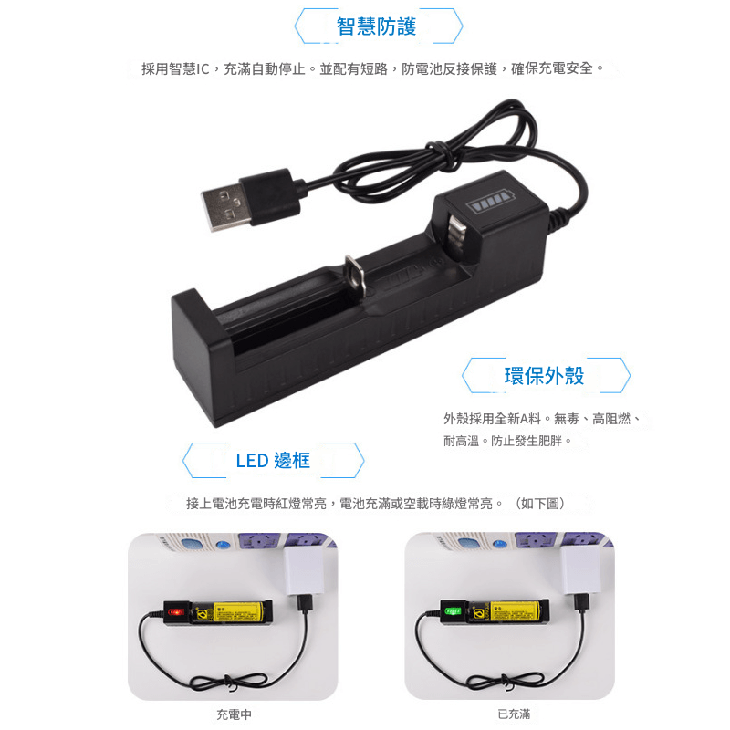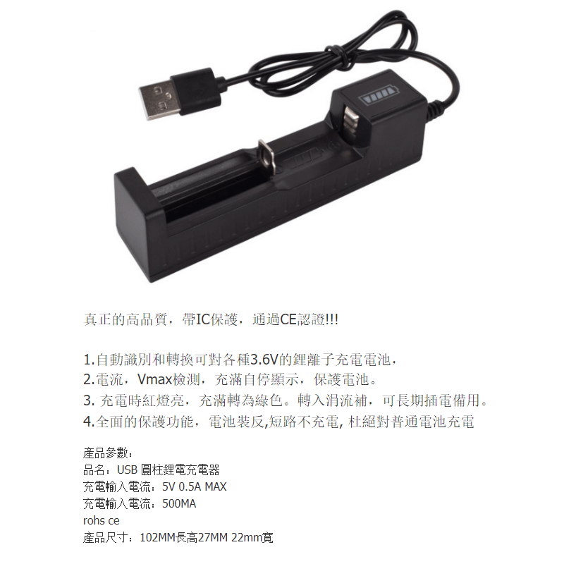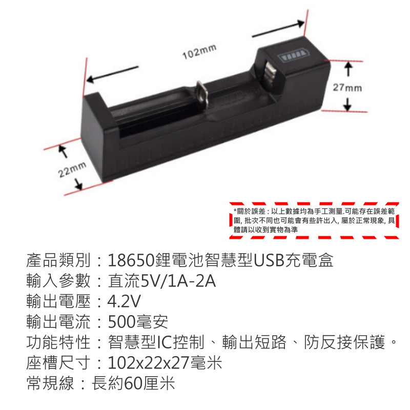 產品名稱:18650鋰電池單顆USB充電器(輸入:5V 0.5A MAX)
