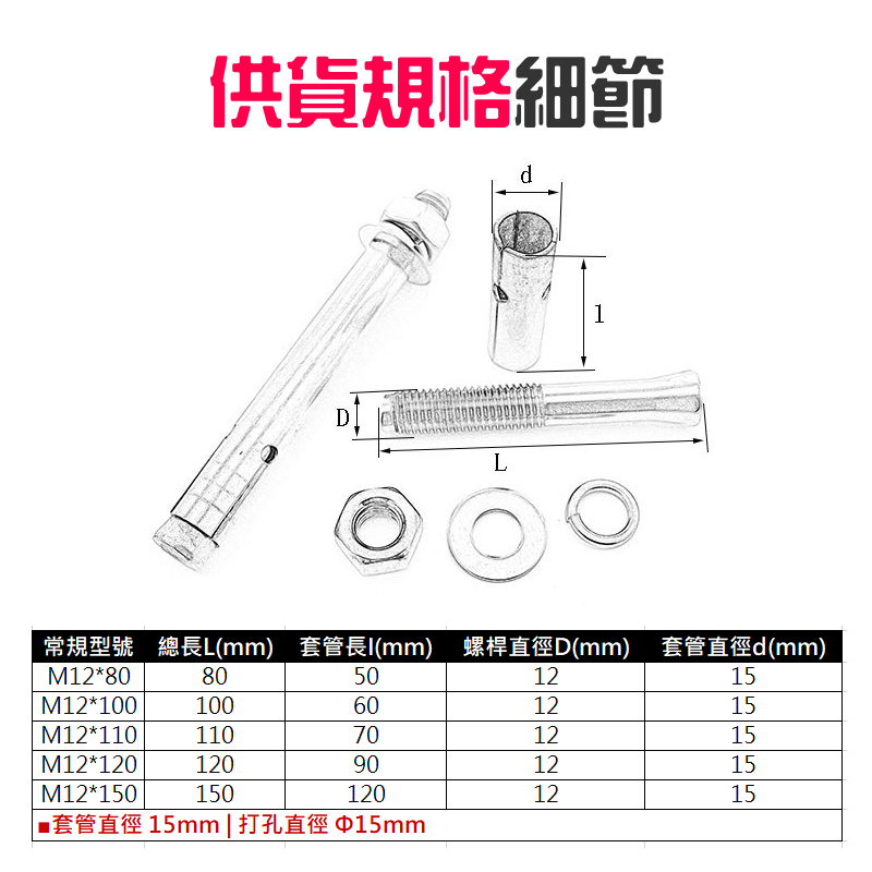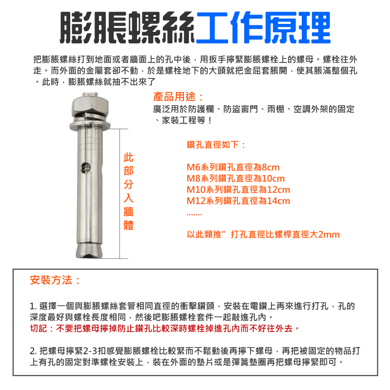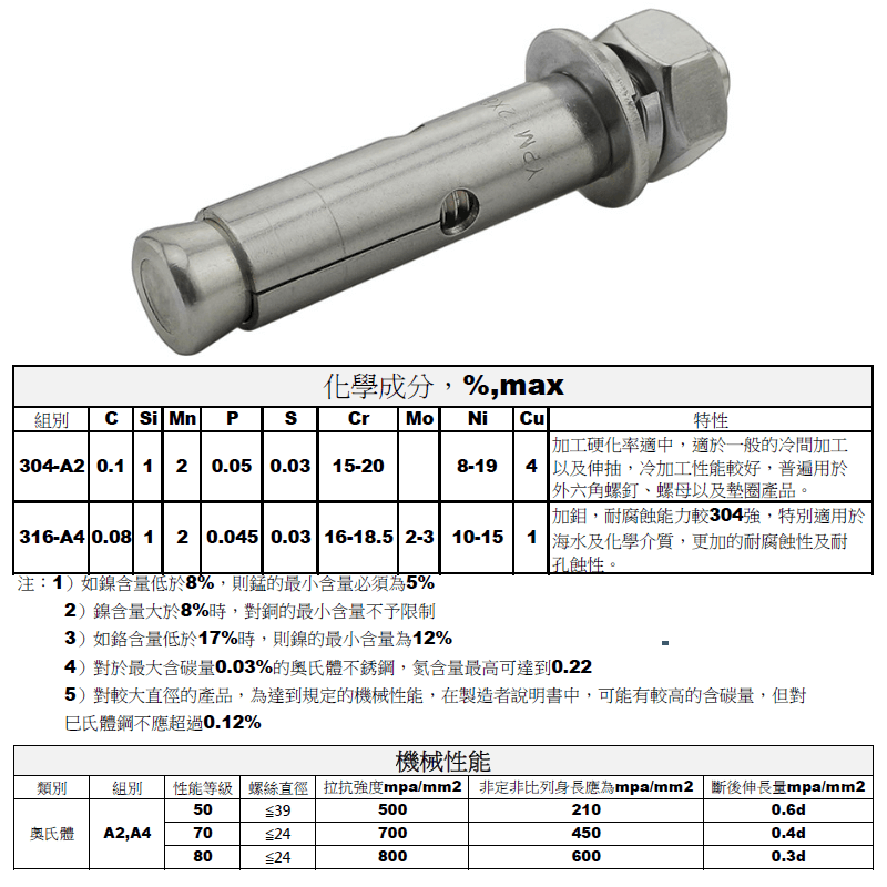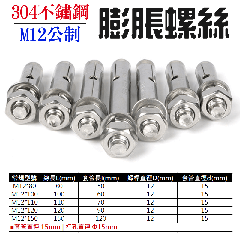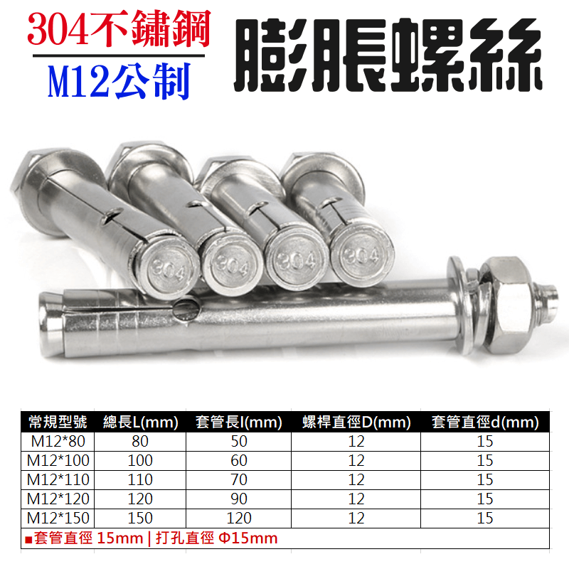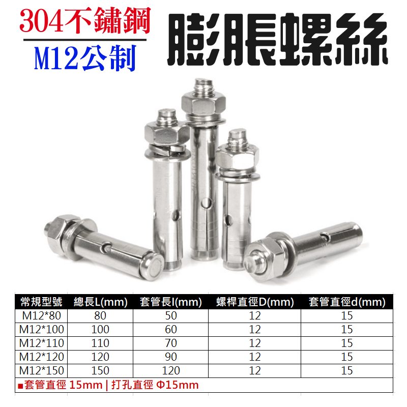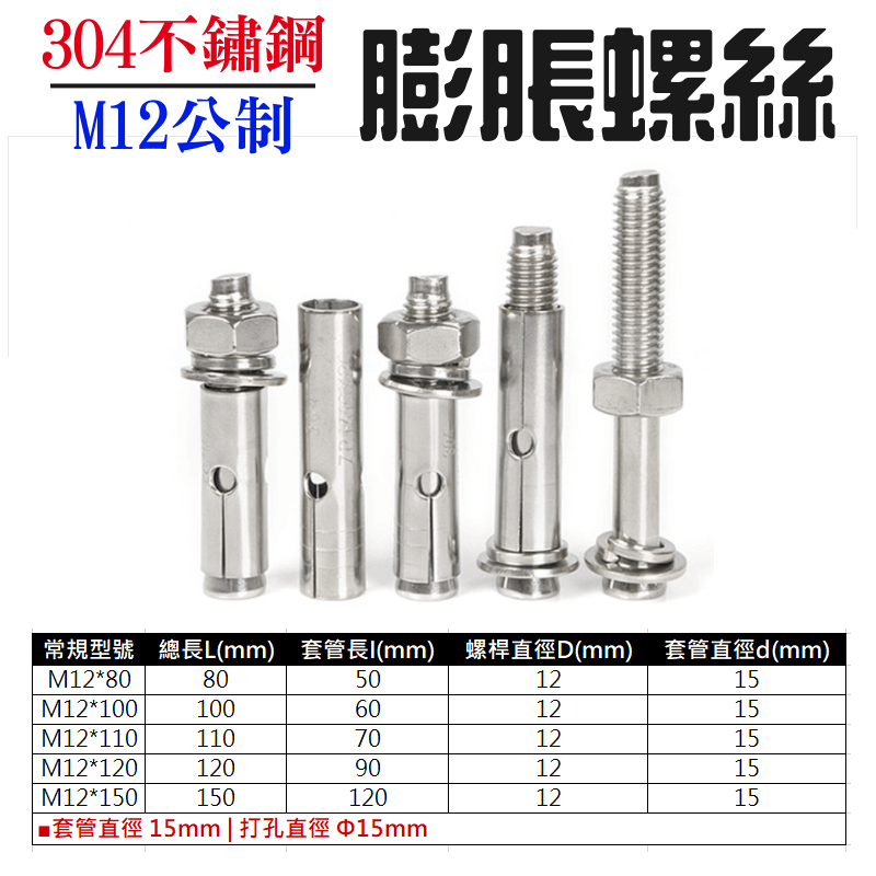 名稱:304不鏽鋼 M12公制 膨脹螺絲
