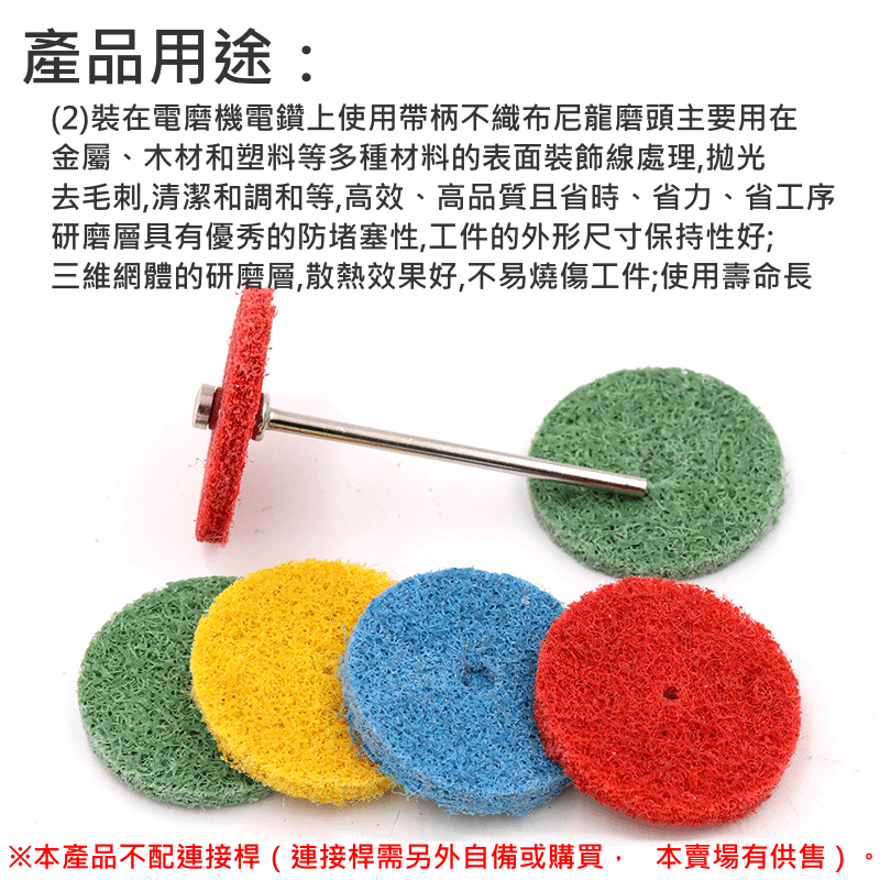 裝在電磨機電鑽上使用帶柄不織布尼龍磨頭主要用在金屬、木材和塑料等多種材料的表面裝飾紋線處理,拋光,去毛刺,清潔和調和等,高效、高品質且省時、省力、省工序。研磨層具有優異的防堵塞性,工件的外形尺寸保持性佳;三維網體的研磨層,散熱效果好,不易燒傷工件;使用壽命長。