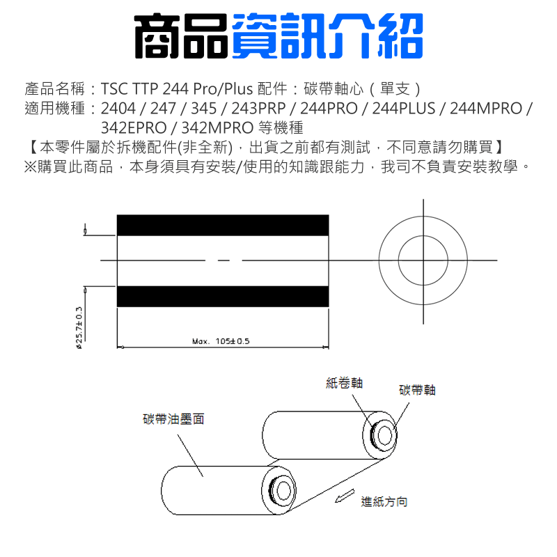產品名稱:TSC TTP 244 Pro/Plus 配件:碳帶軸心(單支)